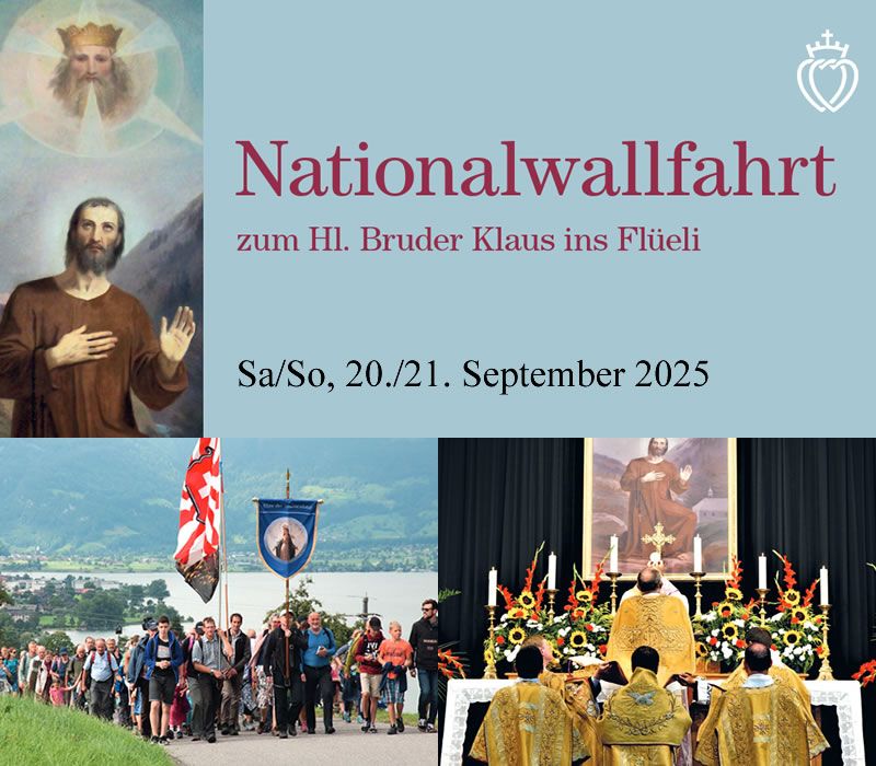 Am Wochenende vom 20./21. September findet eine Nationalwallfahrt zum Landespatron, dem hl. Bruder Klaus ins Flüeli statt, wozu wir Sie (insbesondere alle Schweizer) herzlich einladen. Das Thema ist Ehre, Christus dem König! Im Eingangsbereich der Halle wird die Militia Immaculatae wieder mit einem Schriften-/Aposotlatsstand präsent sein, kommen Sie doch vorbei!