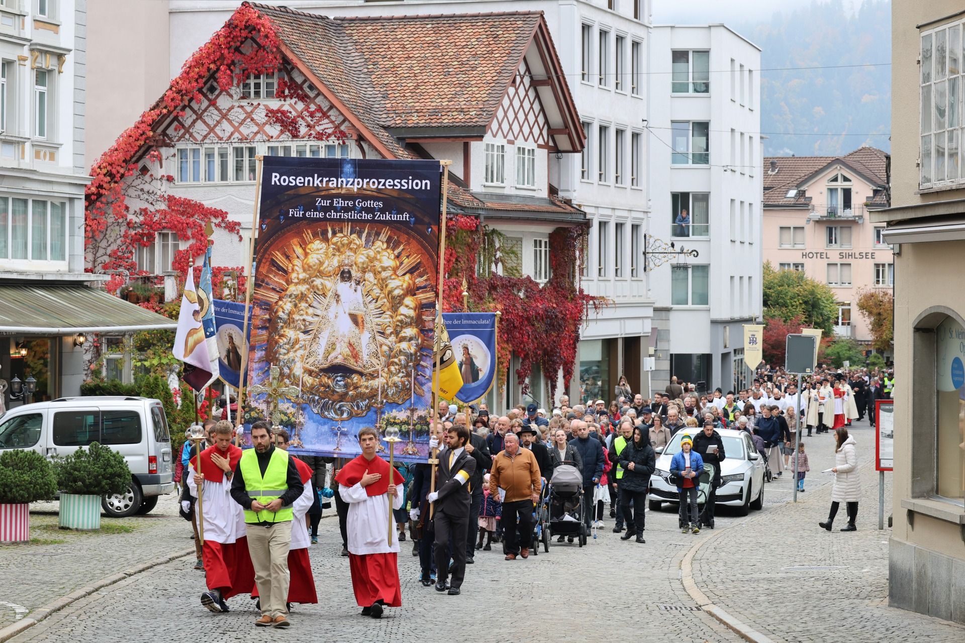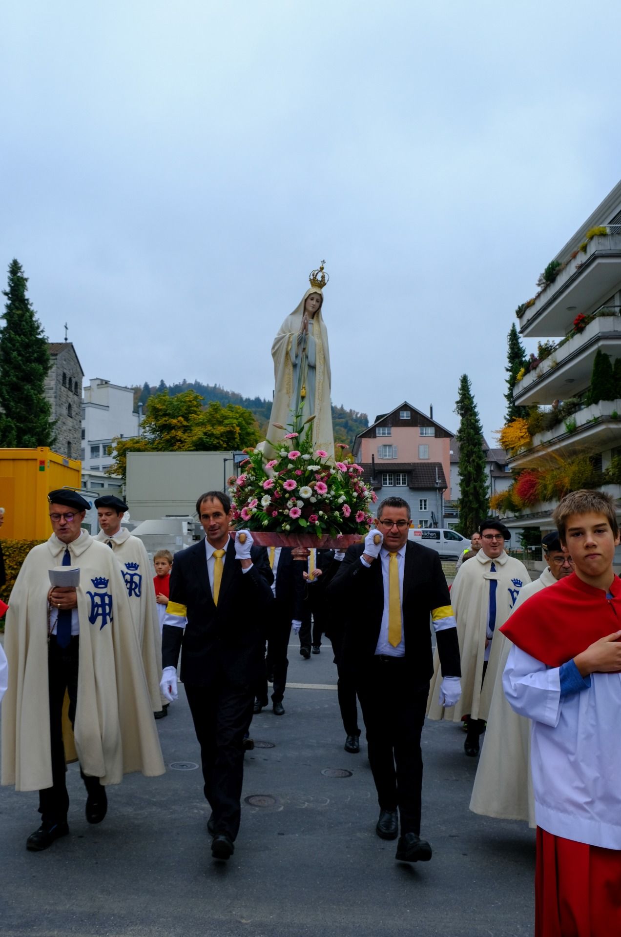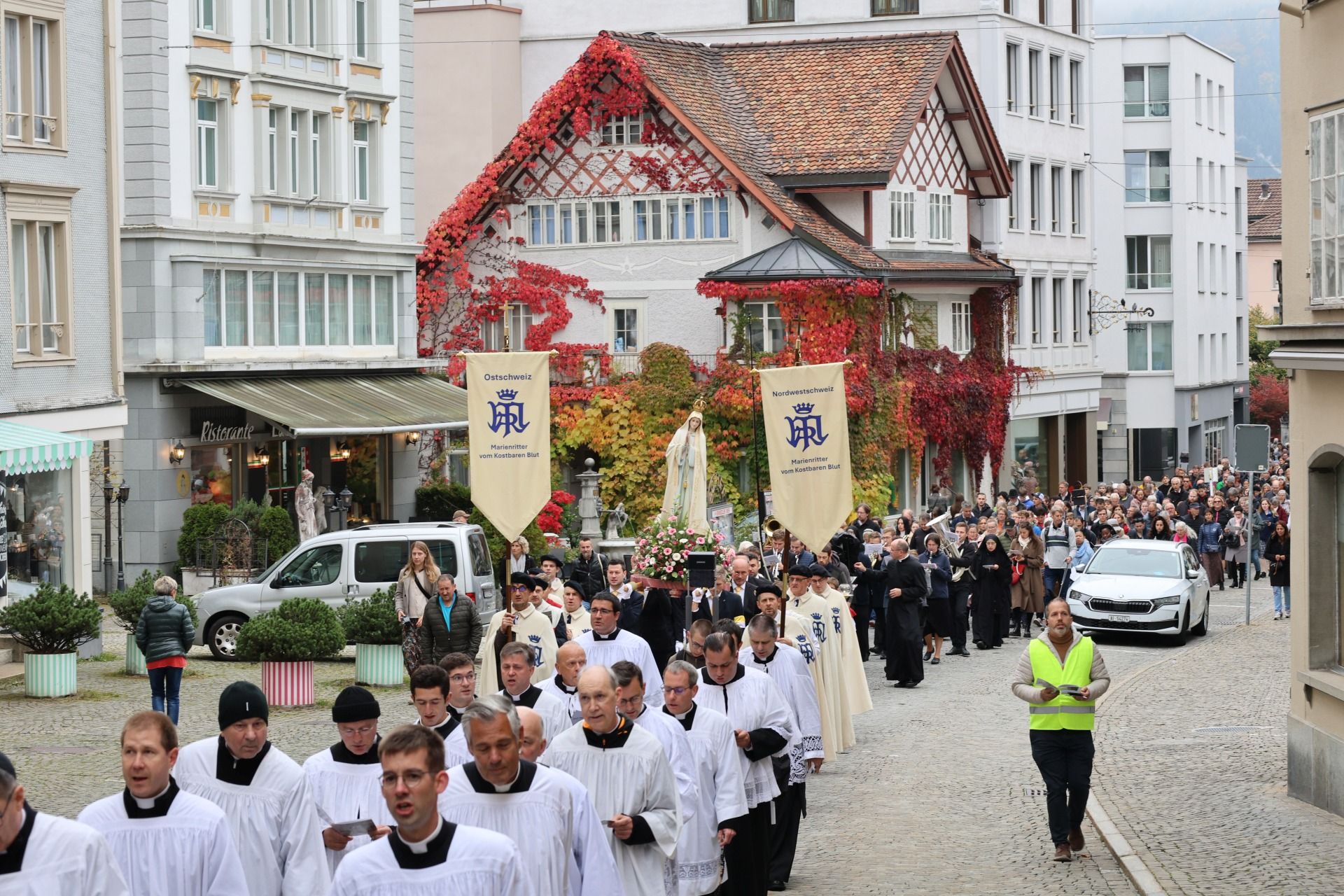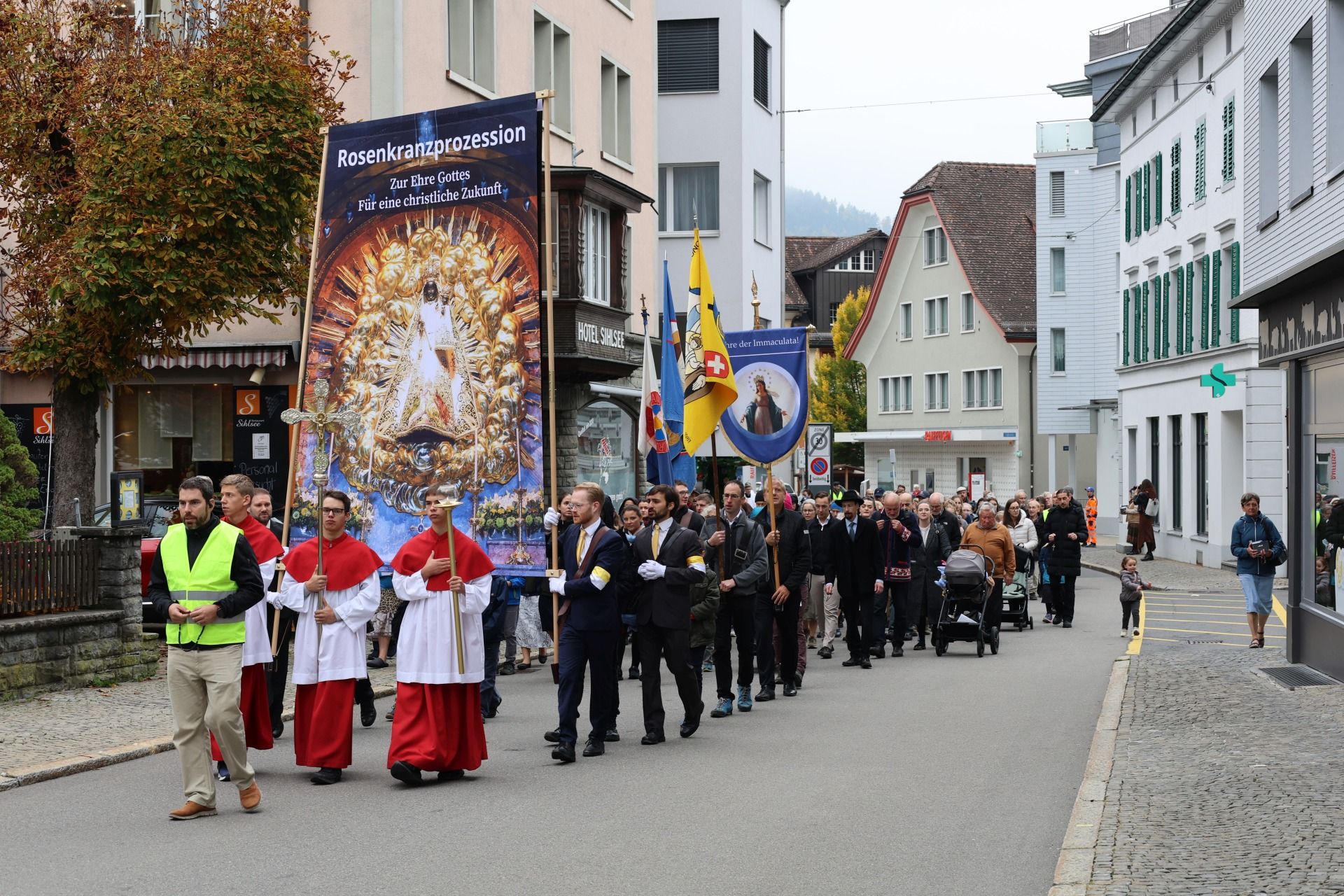 Prozession 12 von 33 webDie Prozession war geprägt von einer tiefen Atmosphäre der Andacht und Freude. Angeführt vom Kreuz und den Ministranten bewegte sich der Zug durch Einsiedeln – begleitet von Blasmusik, Marienliedern und dem gemeinsamen Rosenkranzgebet. In der Mitte wurde eine mit Blumen geschmückte Statue der Muttergottes von Fatima getragen, flankiert von Marienrittern in weissen Mänteln. Viele Passanten blieben stehen, manche schlossen sich spontan an. „Es berührt mich, wie viele junge Menschen hier mitgehen“, sagte eine Teilnehmerin aus der Region Zürich.