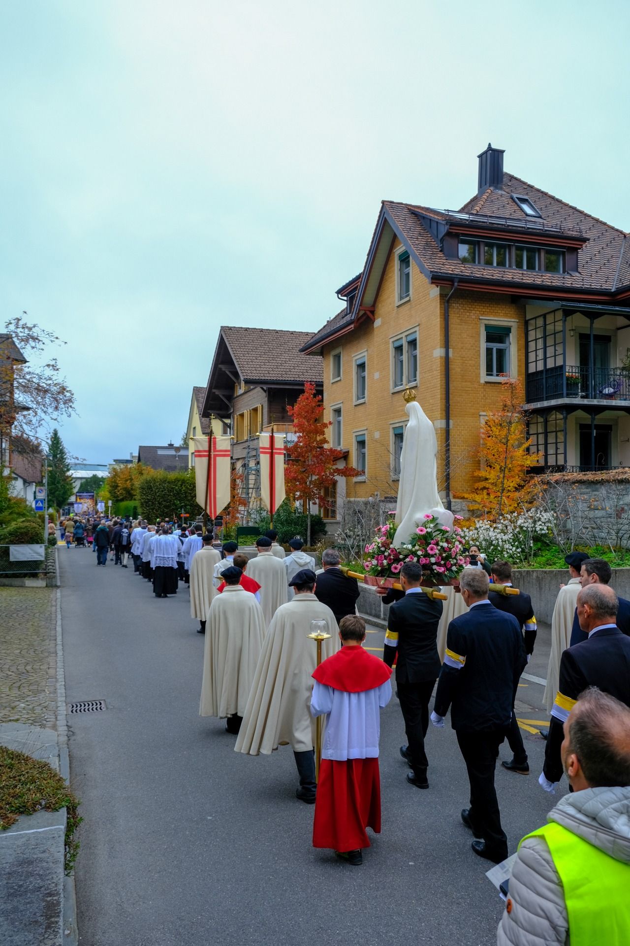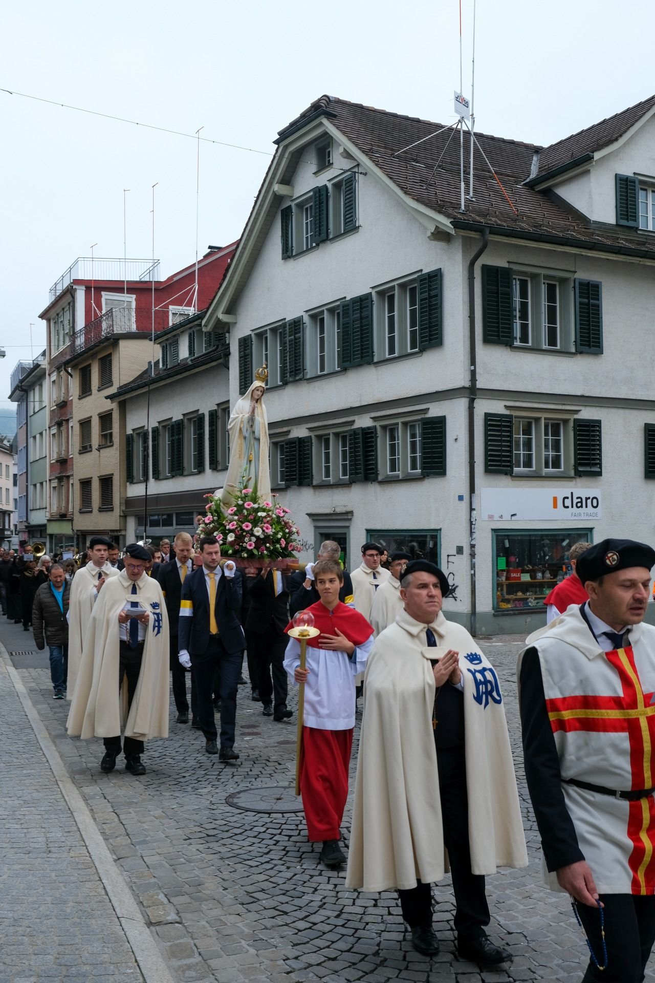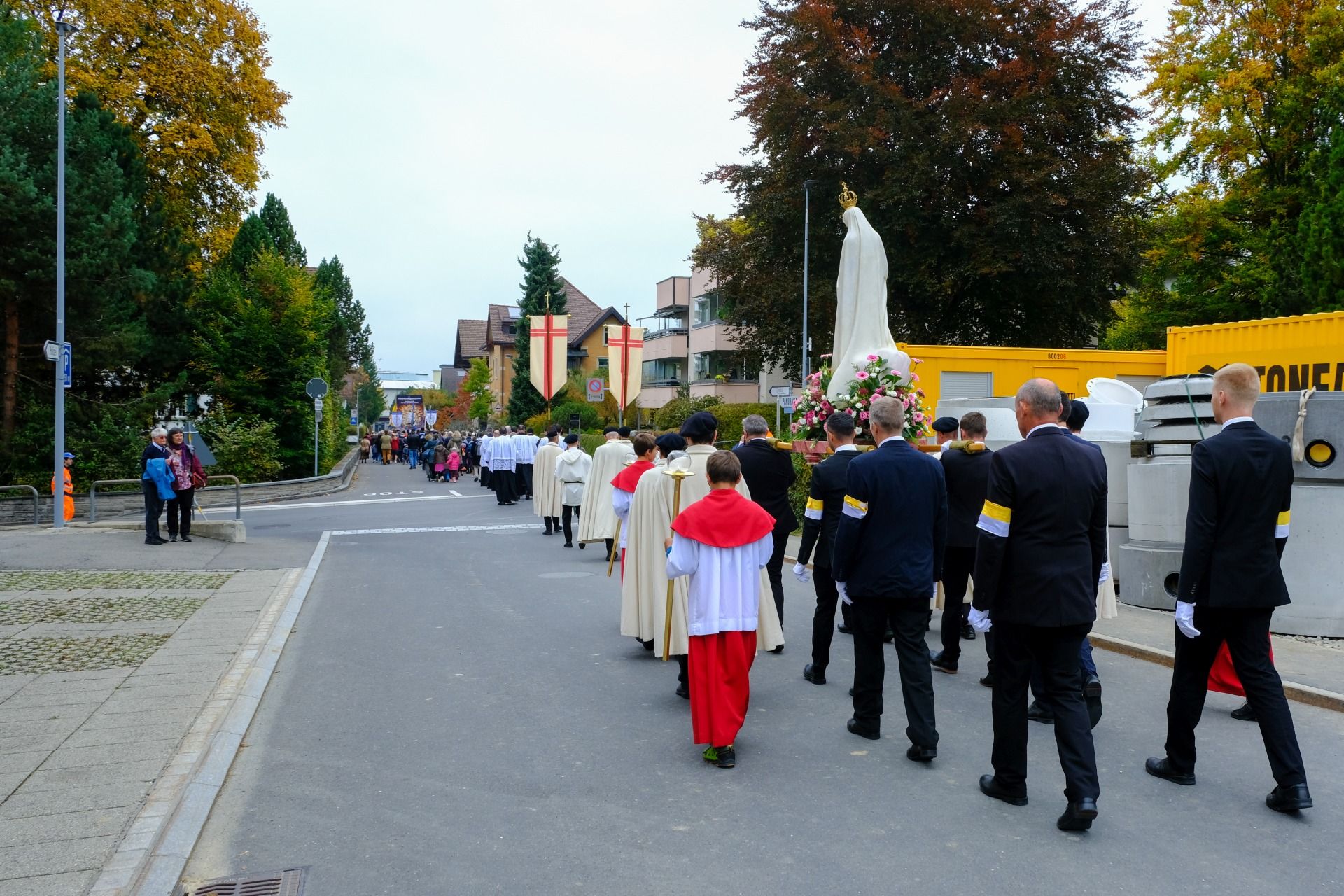 Prozession 12 von 33 webDie Prozession war geprägt von einer tiefen Atmosphäre der Andacht und Freude. Angeführt vom Kreuz und den Ministranten bewegte sich der Zug durch Einsiedeln – begleitet von Blasmusik, Marienliedern und dem gemeinsamen Rosenkranzgebet. In der Mitte wurde eine mit Blumen geschmückte Statue der Muttergottes von Fatima getragen, flankiert von Marienrittern in weissen Mänteln. Viele Passanten blieben stehen, manche schlossen sich spontan an. „Es berührt mich, wie viele junge Menschen hier mitgehen“, sagte eine Teilnehmerin aus der Region Zürich.