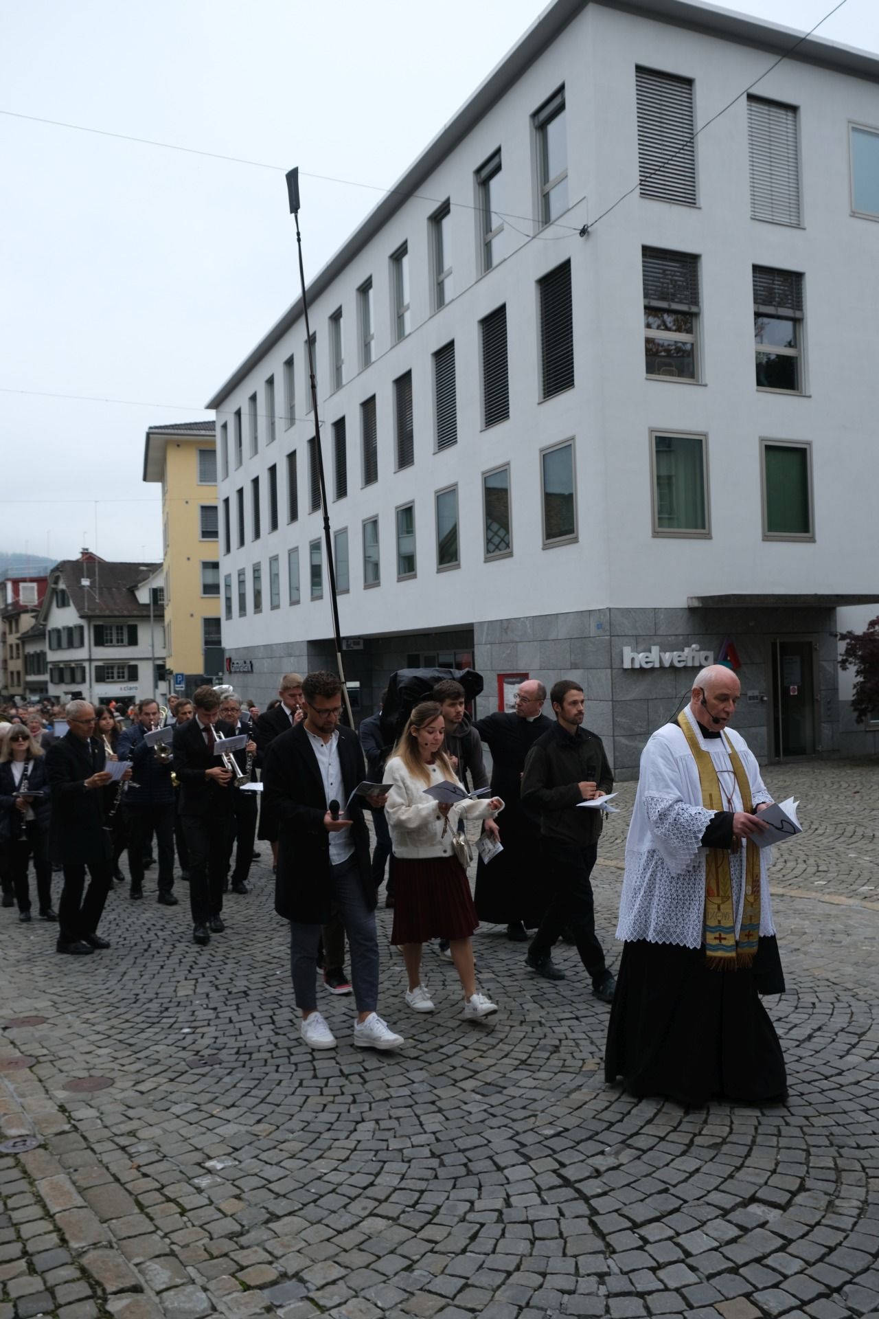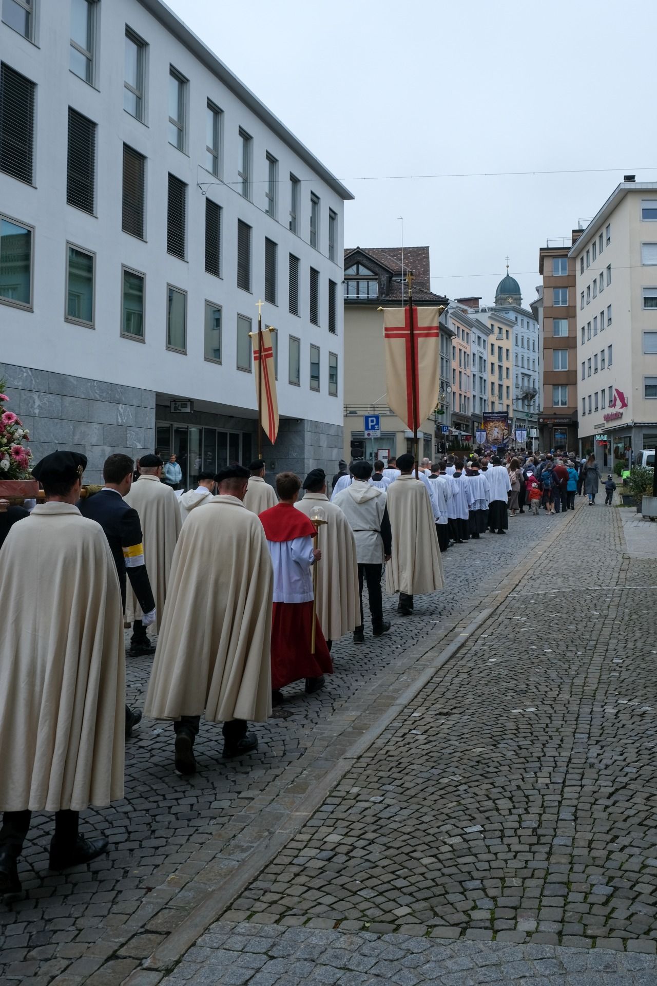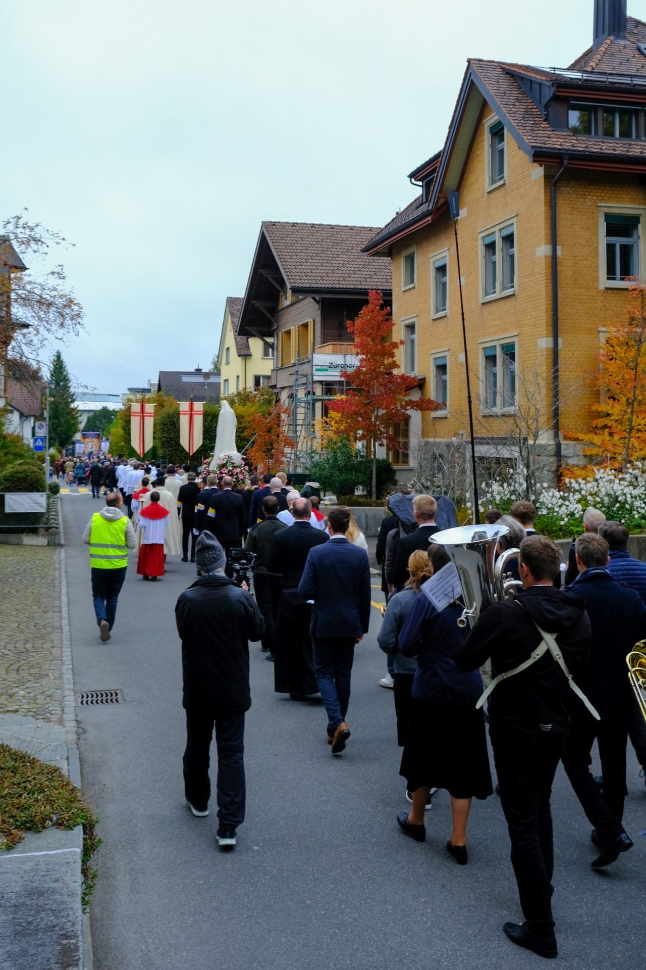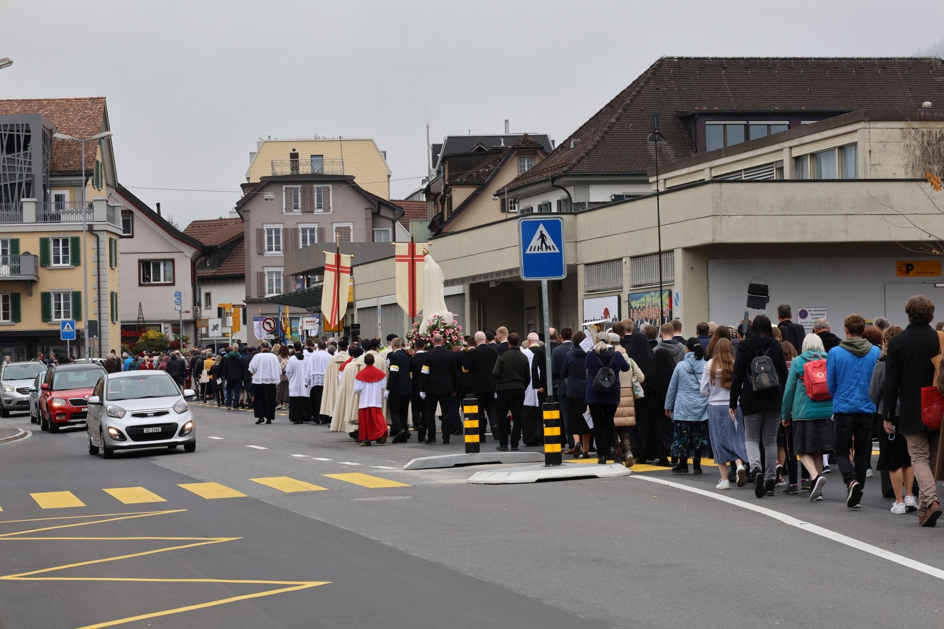 Prozession 12 von 33 webDie Prozession war geprägt von einer tiefen Atmosphäre der Andacht und Freude. Angeführt vom Kreuz und den Ministranten bewegte sich der Zug durch Einsiedeln – begleitet von Blasmusik, Marienliedern und dem gemeinsamen Rosenkranzgebet. In der Mitte wurde eine mit Blumen geschmückte Statue der Muttergottes von Fatima getragen, flankiert von Marienrittern in weissen Mänteln. Viele Passanten blieben stehen, manche schlossen sich spontan an. „Es berührt mich, wie viele junge Menschen hier mitgehen“, sagte eine Teilnehmerin aus der Region Zürich.