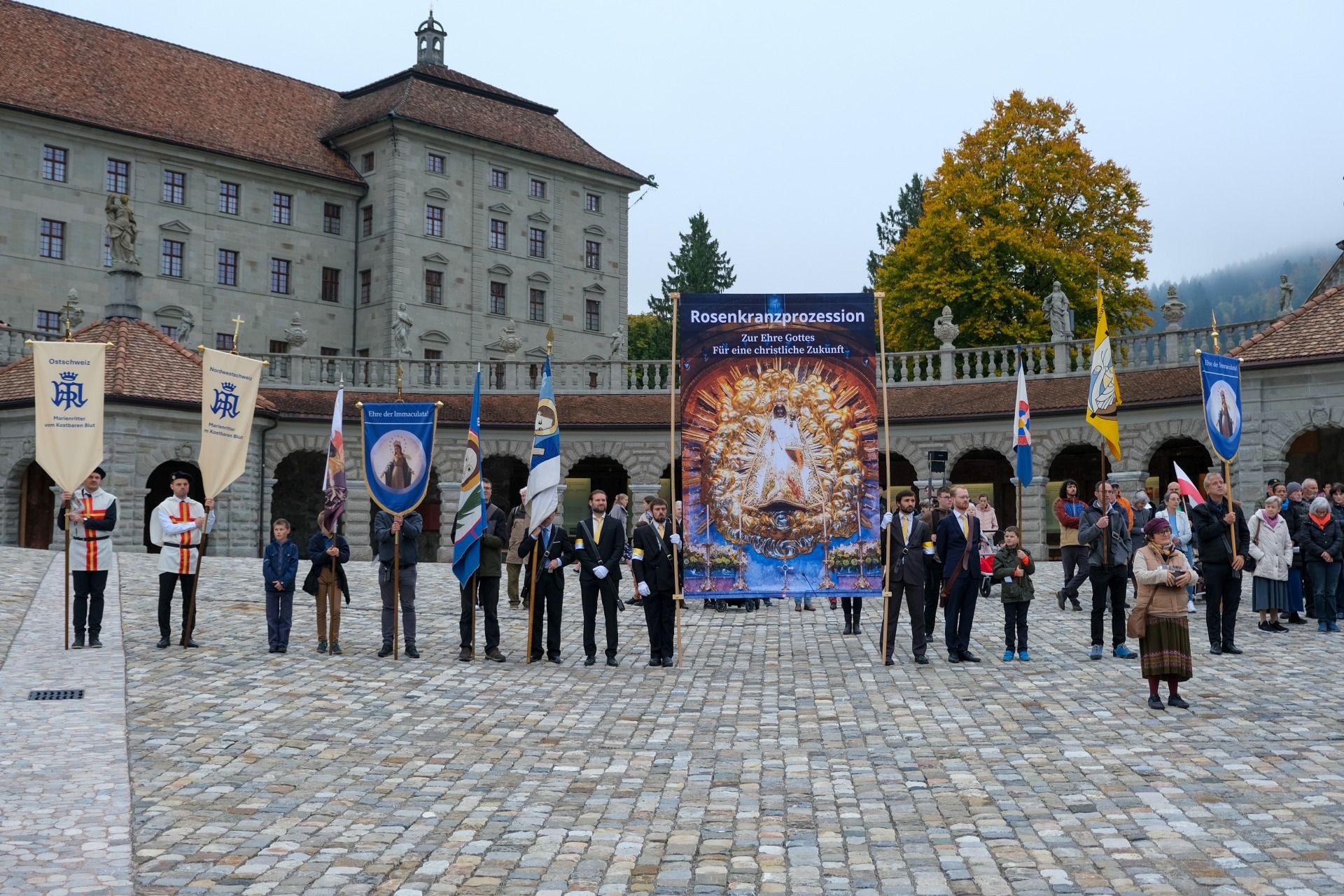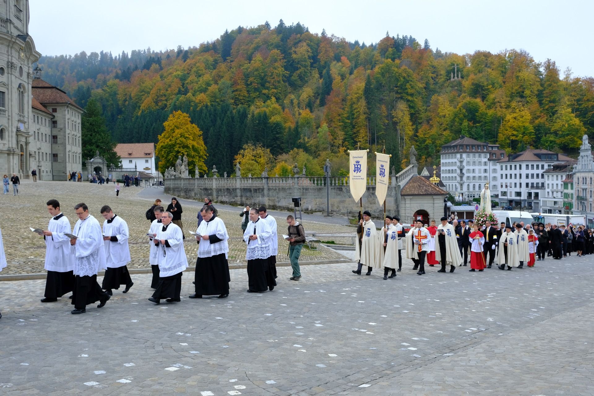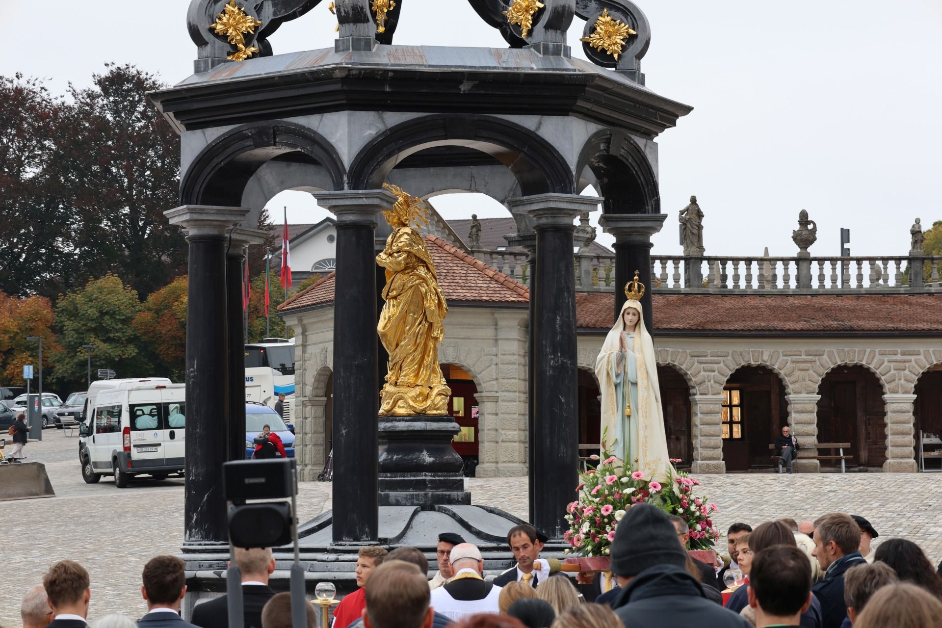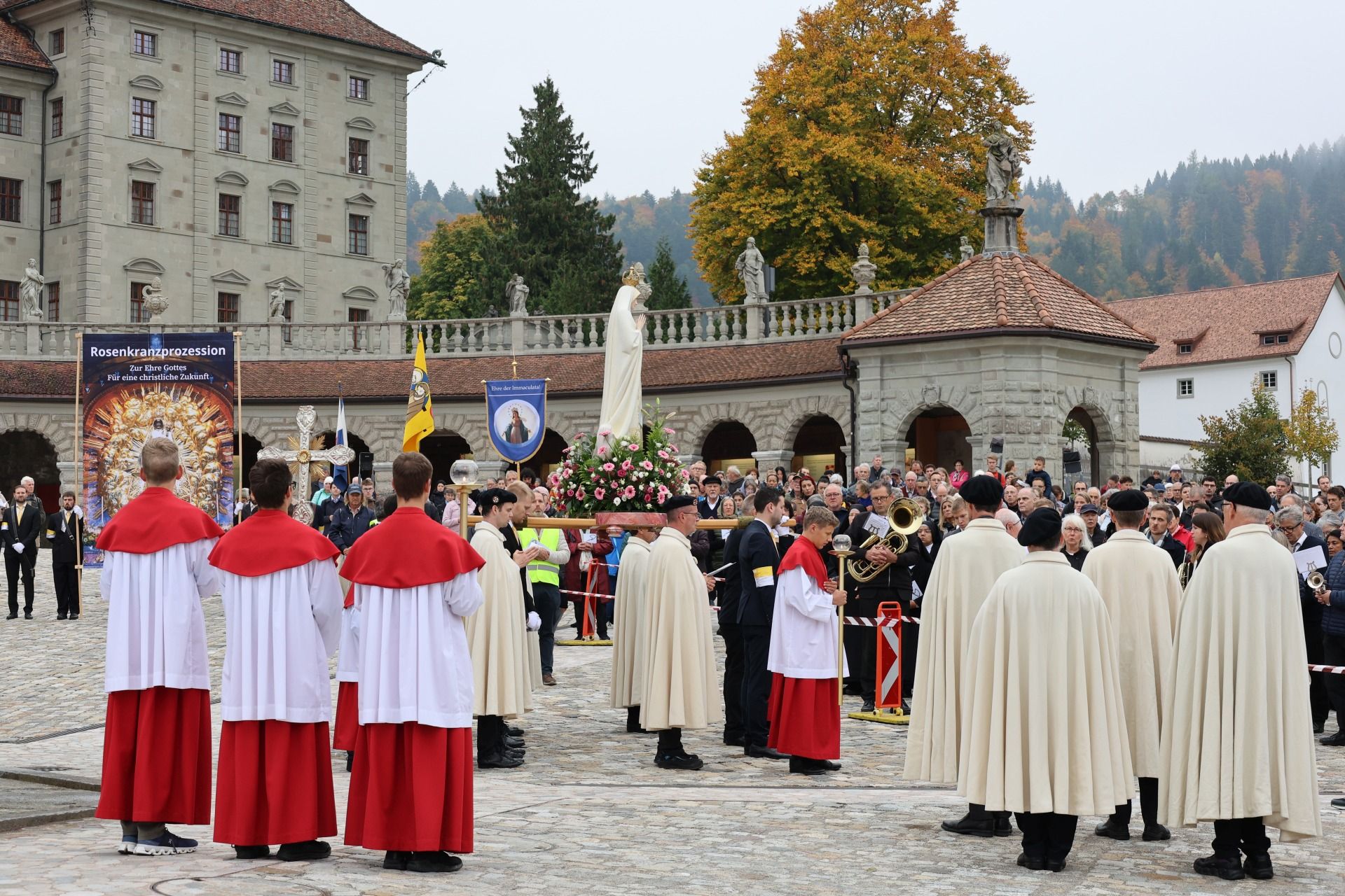 statue kloster ausschnitt„Wir beten für eine christliche Zukunft und für den Frieden.“ – Mit diesen Worten eröffnete Pater Lukas Weber am Samstagnachmittag, 11. Oktober 2025, die Rosenkranzprozession in Einsiedeln. Bei herbstlich bewölktem Wetter zogen rund 750 Personen, darunter viele Familien und Jugendliche, betend und singend durch die Gassen des Wallfahrtsortes.