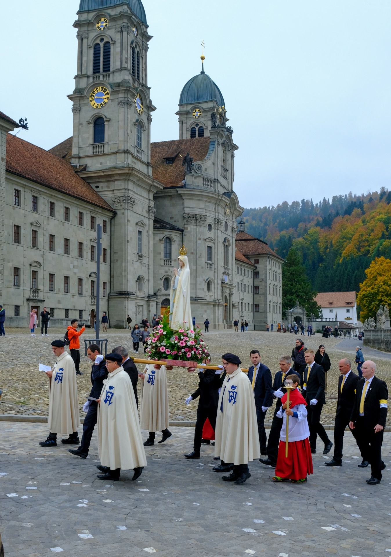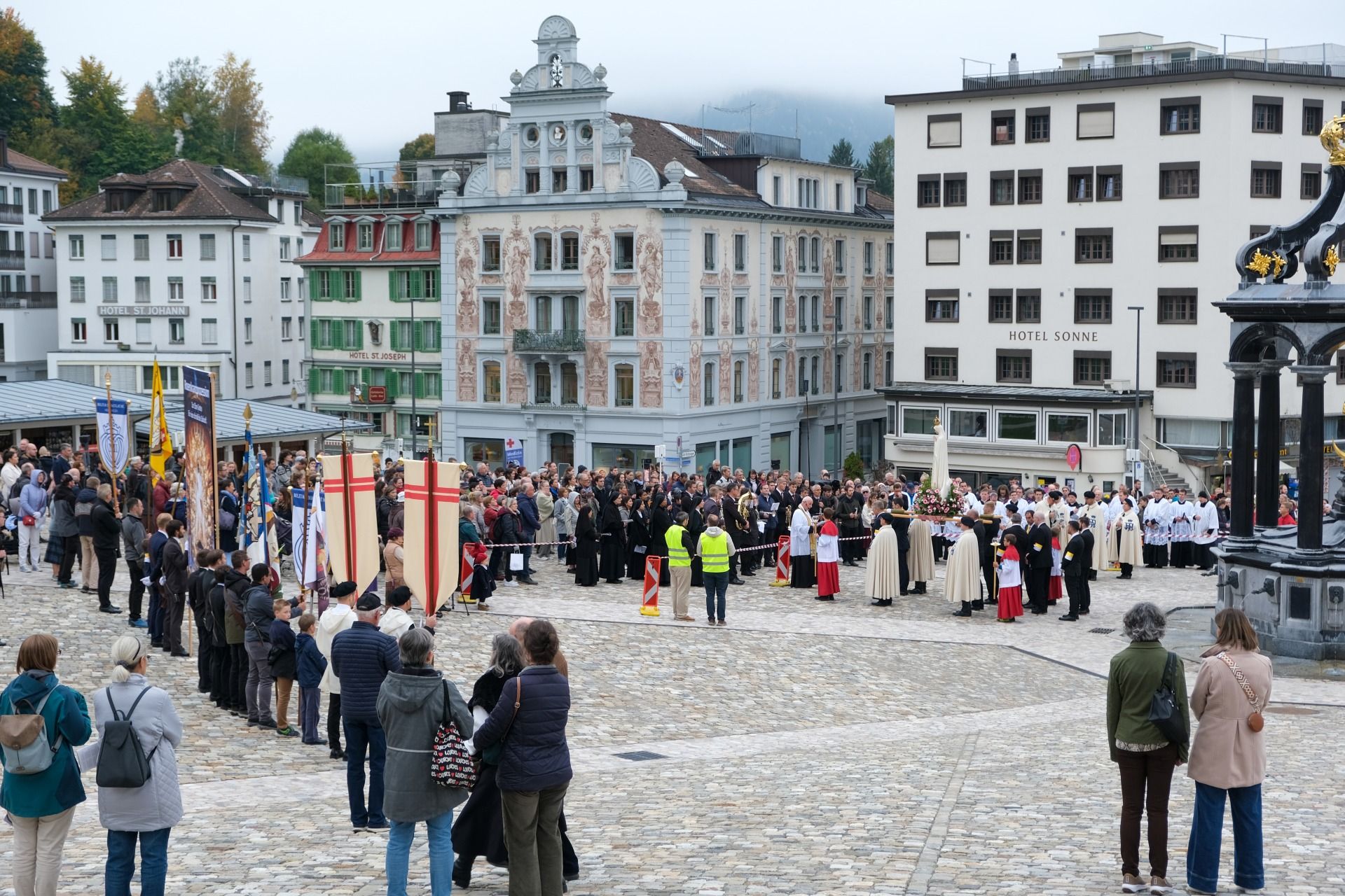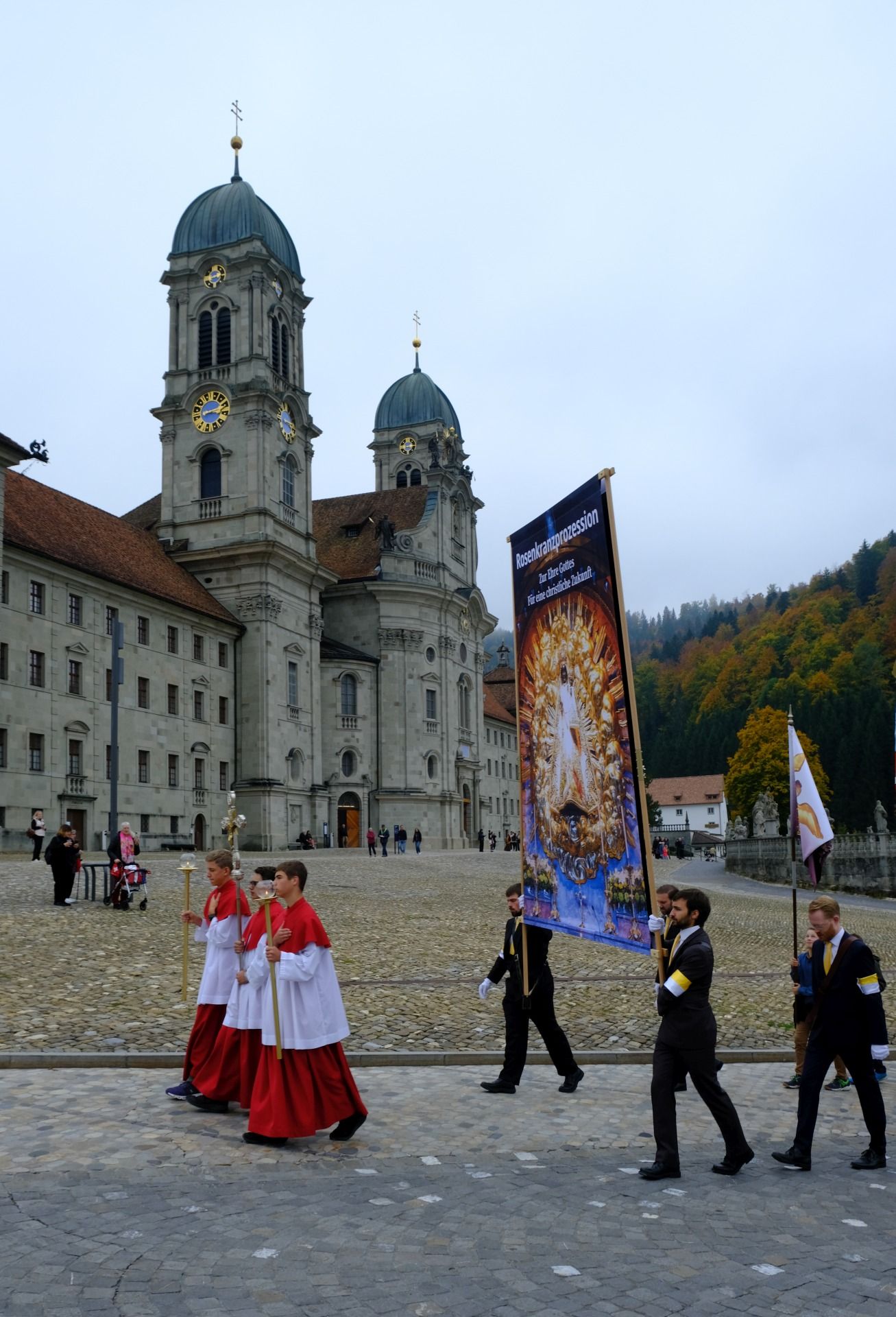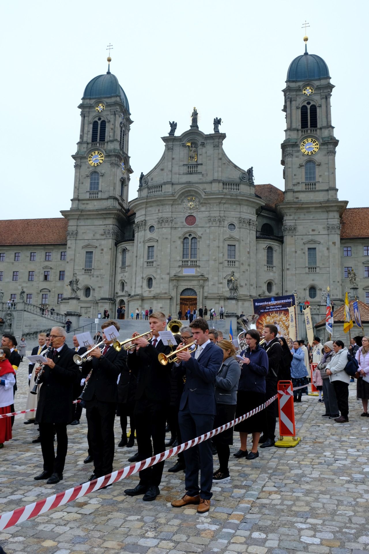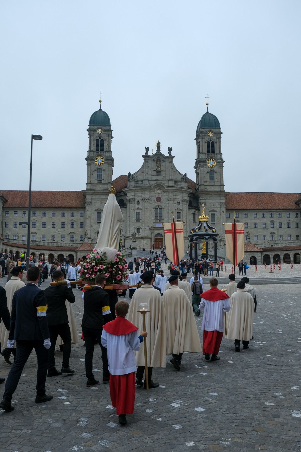 statue kloster ausschnitt„Wir beten für eine christliche Zukunft und für den Frieden.“ – Mit diesen Worten eröffnete Pater Lukas Weber am Samstagnachmittag, 11. Oktober 2025, die Rosenkranzprozession in Einsiedeln. Bei herbstlich bewölktem Wetter zogen rund 750 Personen, darunter viele Familien und Jugendliche, betend und singend durch die Gassen des Wallfahrtsortes.