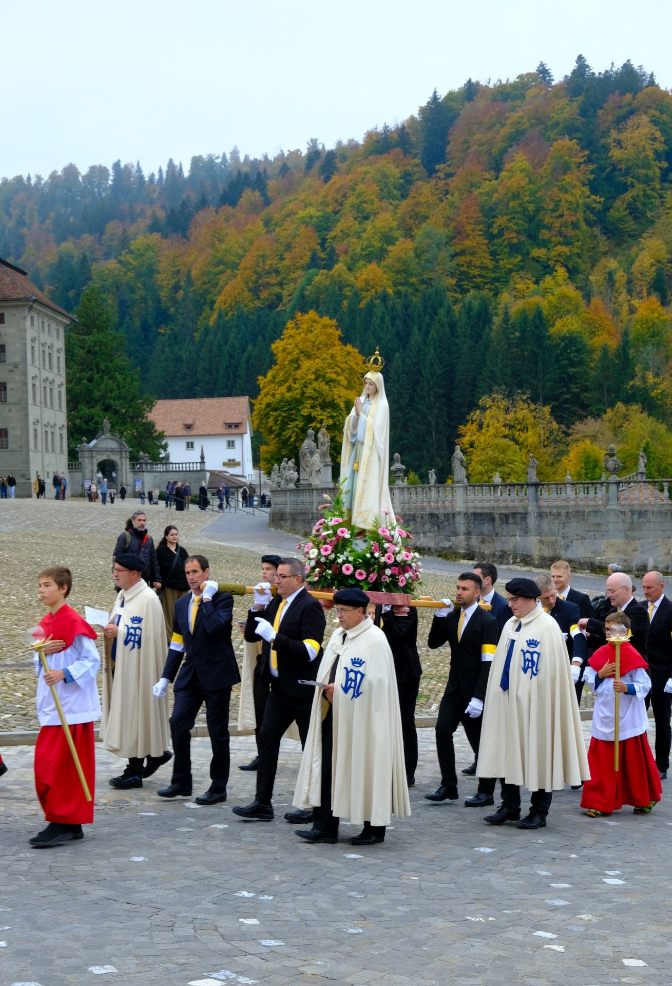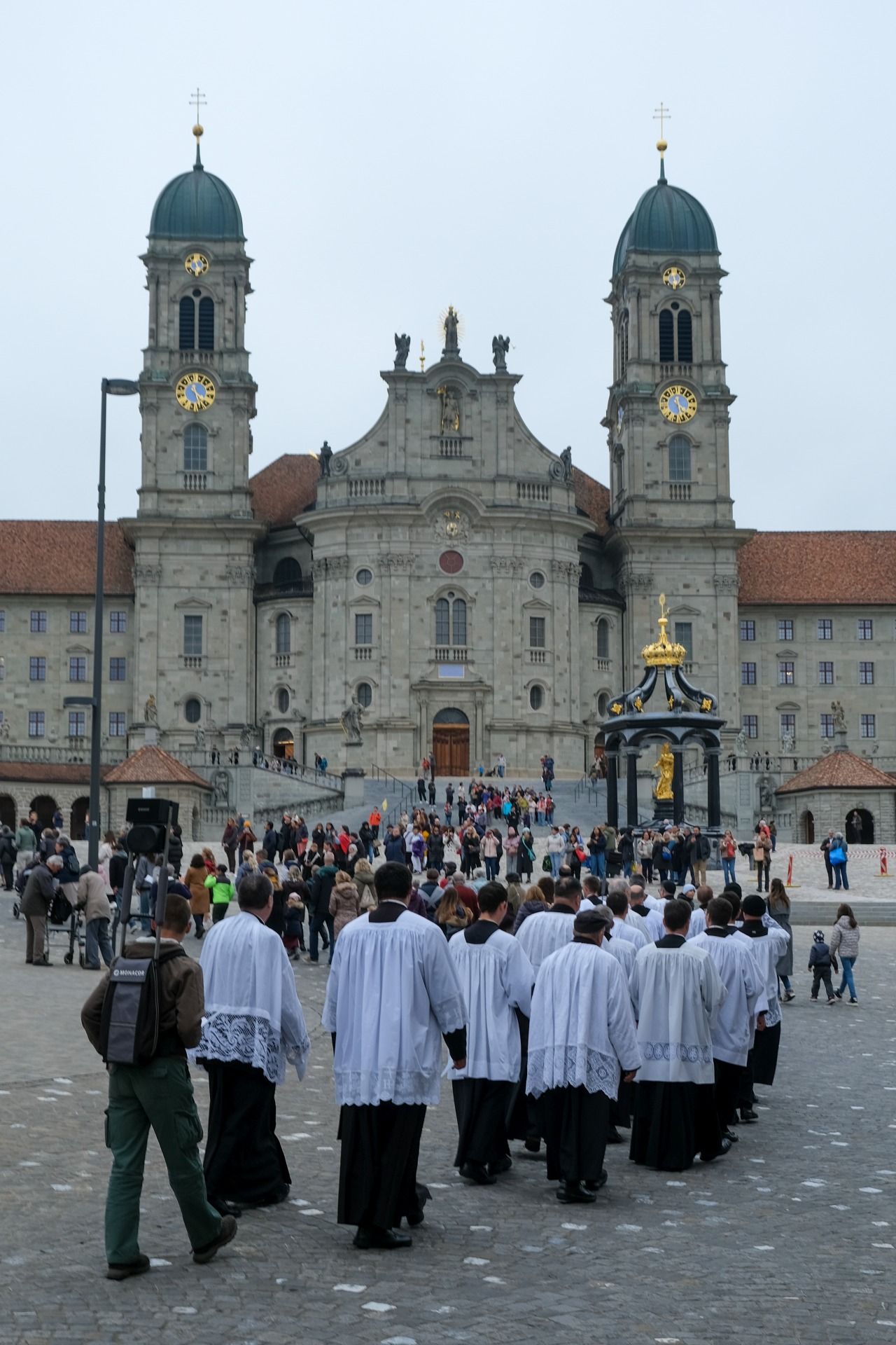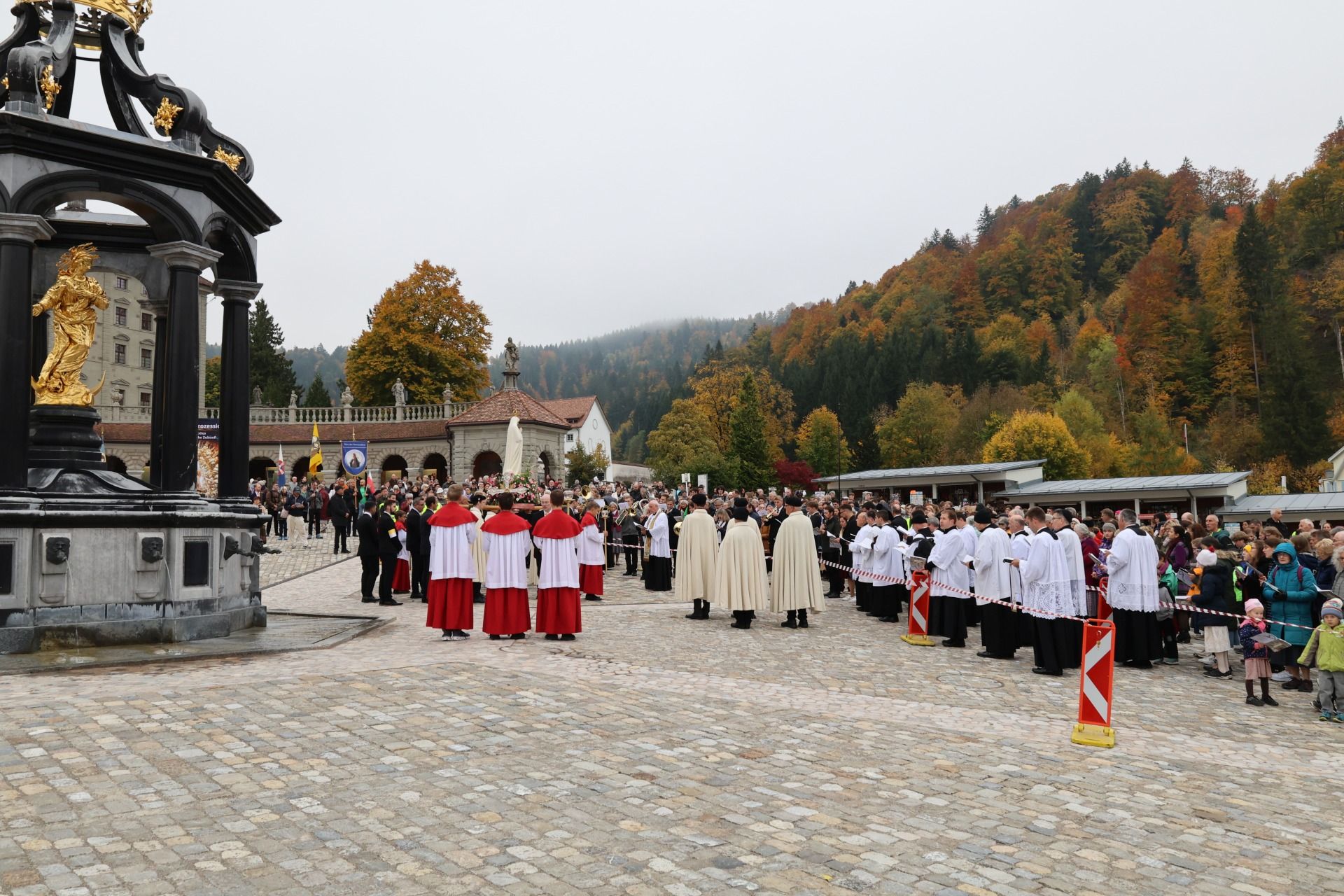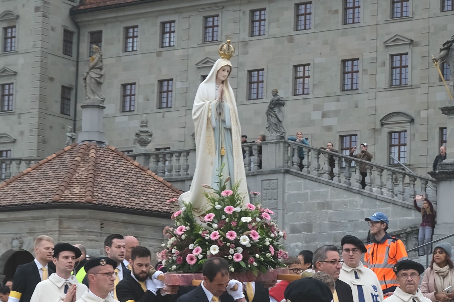 statue kloster ausschnitt„Wir beten für eine christliche Zukunft und für den Frieden.“ – Mit diesen Worten eröffnete Pater Lukas Weber am Samstagnachmittag, 11. Oktober 2025, die Rosenkranzprozession in Einsiedeln. Bei herbstlich bewölktem Wetter zogen rund 750 Personen, darunter viele Familien und Jugendliche, betend und singend durch die Gassen des Wallfahrtsortes.