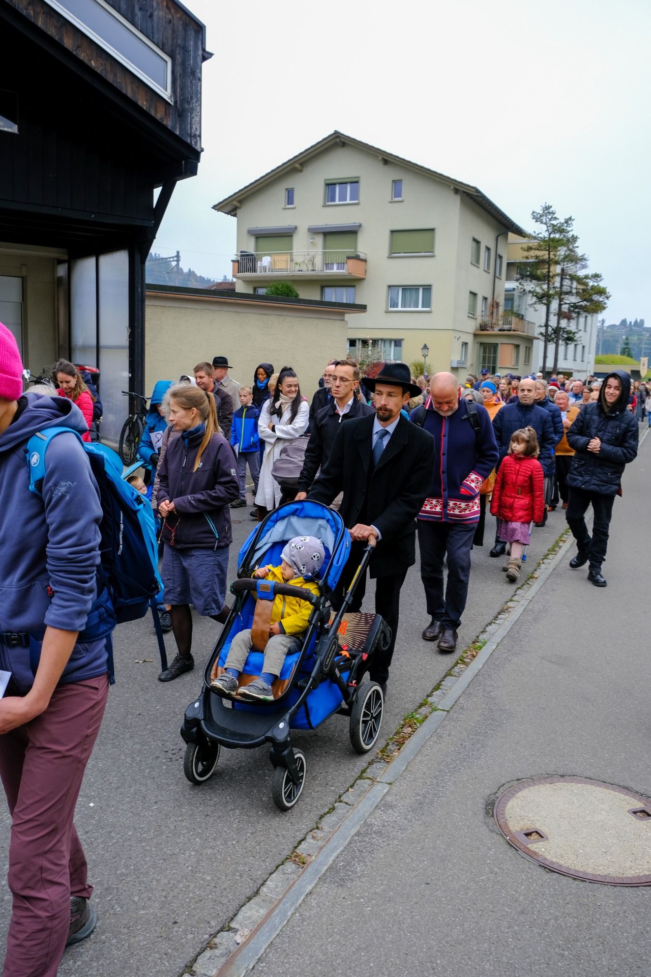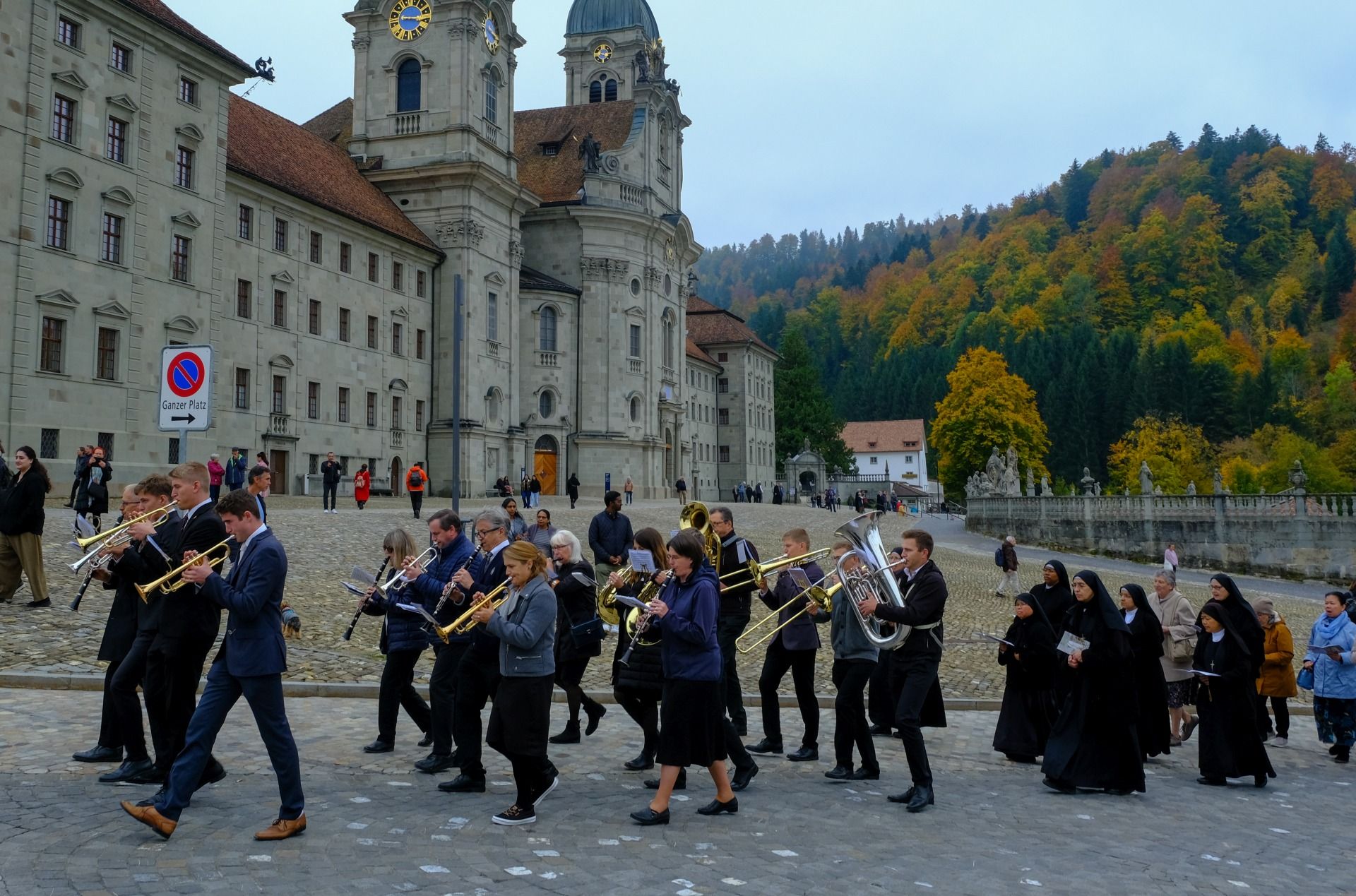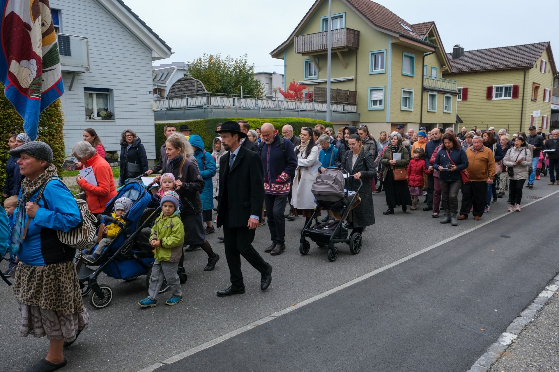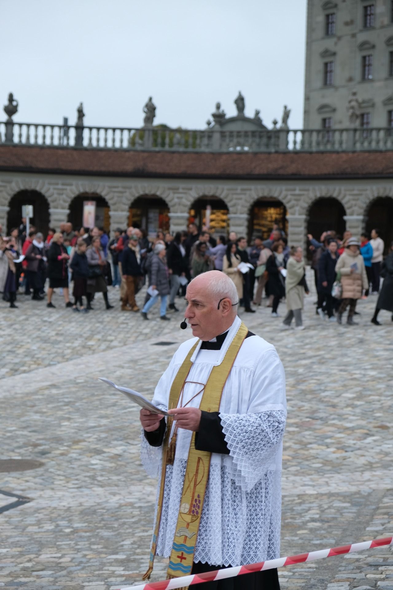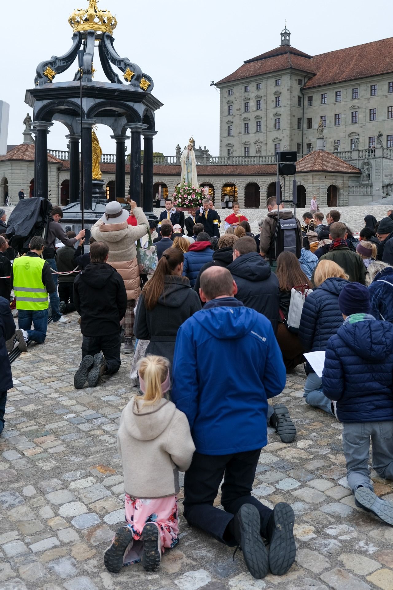 statue kloster ausschnitt„Wir beten für eine christliche Zukunft und für den Frieden.“ – Mit diesen Worten eröffnete Pater Lukas Weber am Samstagnachmittag, 11. Oktober 2025, die Rosenkranzprozession in Einsiedeln. Bei herbstlich bewölktem Wetter zogen rund 750 Personen, darunter viele Familien und Jugendliche, betend und singend durch die Gassen des Wallfahrtsortes.
